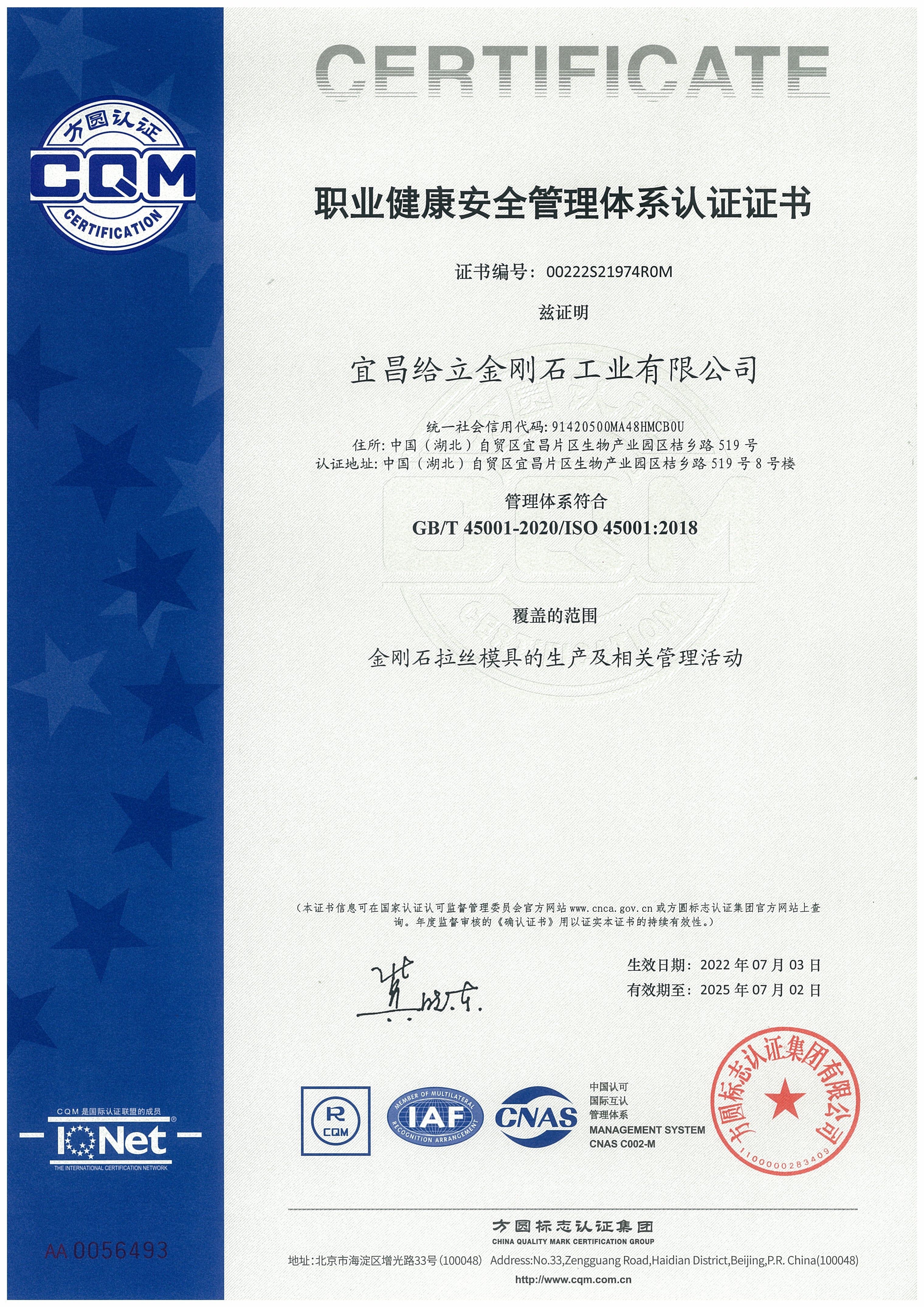 2022年7月3日,宜昌給立金剛石工業(yè)有限公司金剛石拉絲模具產(chǎn)品及生產(chǎn)過程獲得方圓標志認證集團頒發(fā)的《GB/T 45001-2020/ISO45001:2018》職業(yè)健康安全管理體系認證證書。